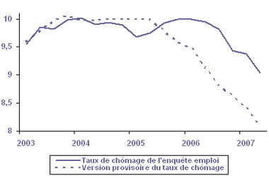 L'Insee a décidé de ne plus calculer tous les mois le taux de chômage au sens du bureau international du travail (BIT) à l’aide du nombre de demandeurs d’emplois inscrits en fin de mois (DEFM) à l’ANPE..Selon l’enquête emploi, dans la période la plus récente, la baisse du taux de chômage BIT a en effet été plus tardive et de moindre ampleur que ne l’indiquaient les chiffres provisoires, fondés sur les DEFM (graphique). La baisse aurait ainsi commencé début 2006, et pas à la mi-2005 ; elle s’élèverait à -1 et non à -1,9 points ; le taux de chômage (9 % au 2e trimestre 2007) ne serait finalement pas passé sous son point bas de 2001 (8,6 %) et ne serait donc pas revenu à son niveau de 1982 (8,1 %). Source : rapport des inspections générales. Pourtant, l’Insee devrait annoncer début novembre une révision limitée du taux de chômage BIT. L’ampleur de la révision sera en fait masquée par un changement d’interprétation des critères BIT qui conduira à une révision de -0,7 point en moyenne sur toute la période. L’Insee modifiera en effet le critère de recherche active d’emploi : une personne sans emploi et disponible, qui s’inscrit à l’ANPE, mais ne cherche pas d’emploi, ne sera plus comptée comme chômeur. Sans ce changement méthodologique, la révision à la hausse serait de 0,9 point. Certes, cette modification présente l’intérêt de séparer totalement la mesure du chômage de l’inscription à l’ANPE et d’harmoniser les indicateurs de l’Insee et d’Eurostat (lorsqu’on considère le taux de chômage de la France entière qui inclut les DOM). Mais, et c’est le point essentiel, contrairement à ce qu’indique le rapport des inspections générales, les DEFM ne peuvent pas être utilisées pour analyser l’évolution globale du chômage, mais bien plutôt pour mener des cétudes à des niveaux géographiques fins que ne permet pas l’enquête emploi. La période récente a montré que certains changements des règles de gestion de l’ANPE auraient conduit cette source à surestimer la baisse du taux de chômage de -0,2 à -0,4 point (document d’étude de la Dares). La réforme de l’indemnisation chômage de 2003 pourrait également avoir amplifié la baisse, dans des proportions qu’on ne sait toujours pas chiffrer quatre ans plus tard, mais qui expliquent peut-être le solde de l’écart de 0,9 point observé en fin de période. Les DEFM, même accompagnées de notes sur les multiples facteurs pouvant affecter leur évolution, ne sont donc pas utilisables en temps réel pour décrire l’évolution du chômage à court terme. [1] L’Insee devrait également publier un taux de chômage incluant les départements d’outre-mer. | |